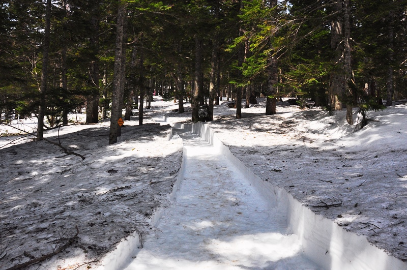 沼山休憩舎から登山道に入りますが、まだ残雪は豊富で親切に雪切をしてある遊歩道を辿っていくのです。