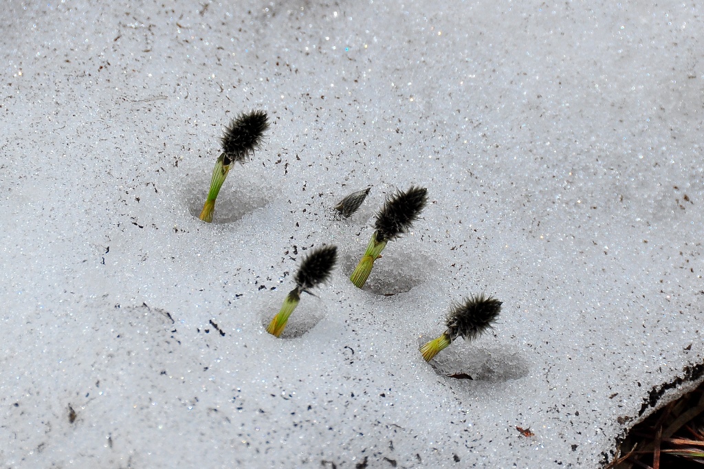おやワタスゲ・・・頭の黒いツクシのような姿ですが、時期がくれば真綿のような姿に変身します。