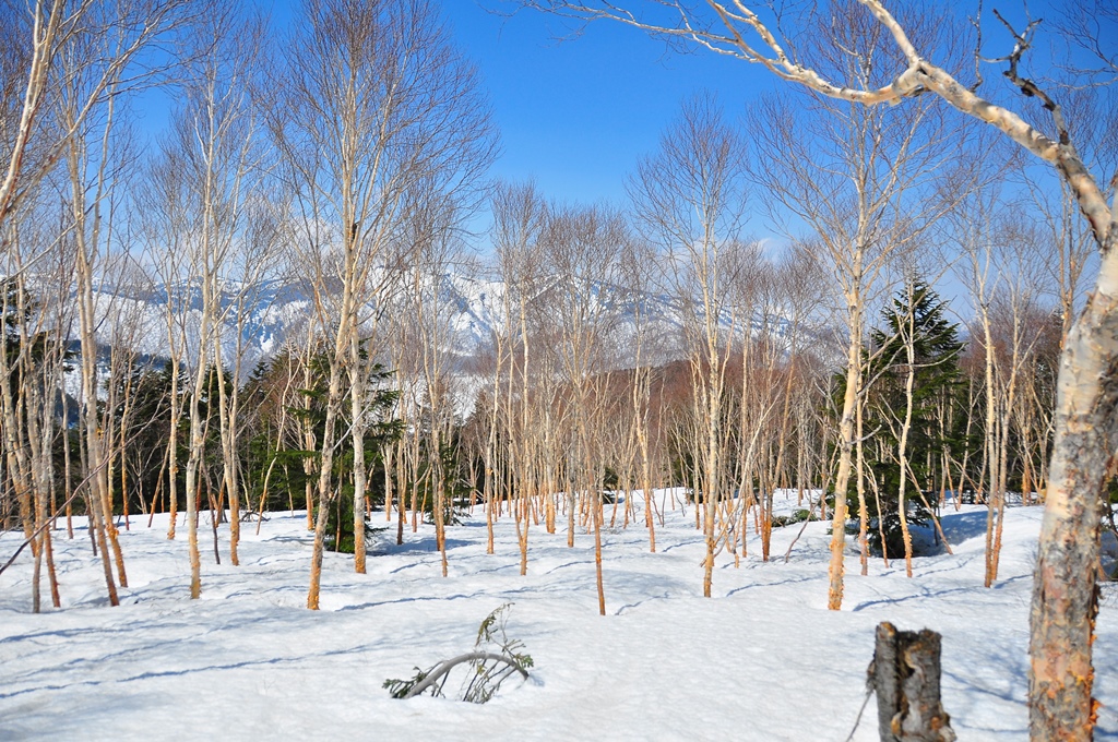 美しい残雪の樹林帯を進んでいくのですが、この辺りは所々に赤テープマーキングがあり安心してルートを刻めます。
