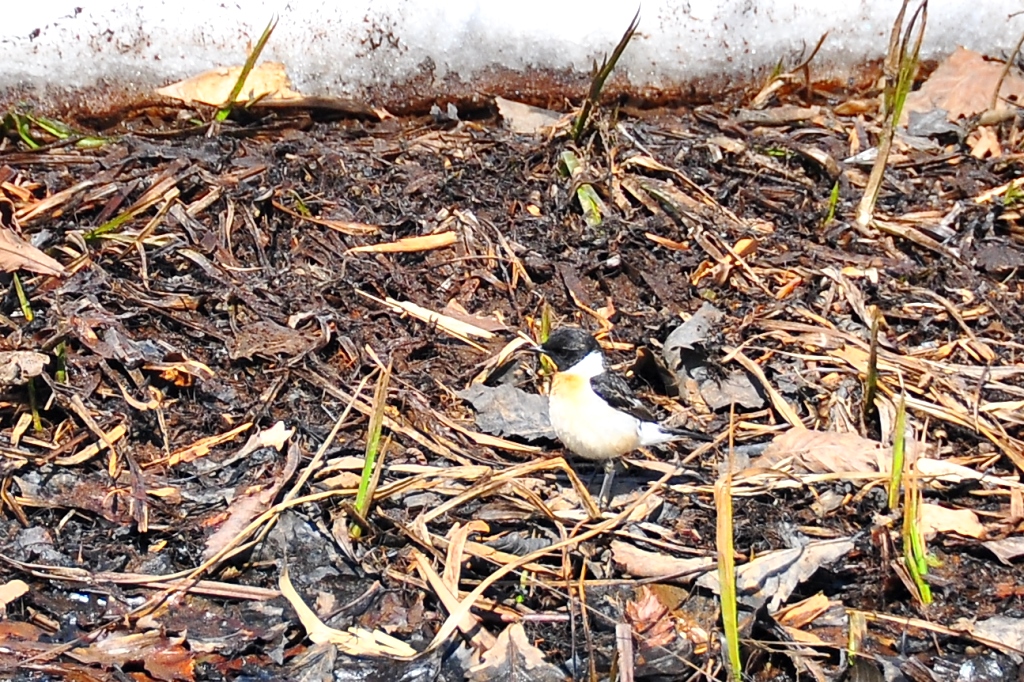 雪解けの小さな湿原には夏羽の婚姻色に飾りたてたノビタキくん。